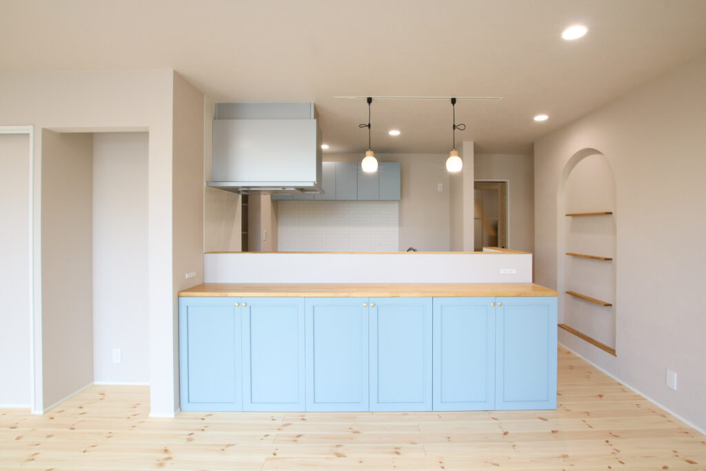 ナチュラルな木の温もりとブルーのキッチンが映える家
