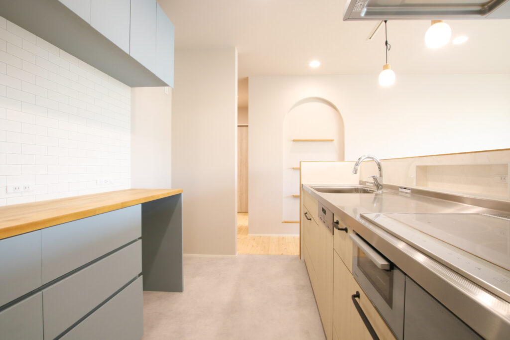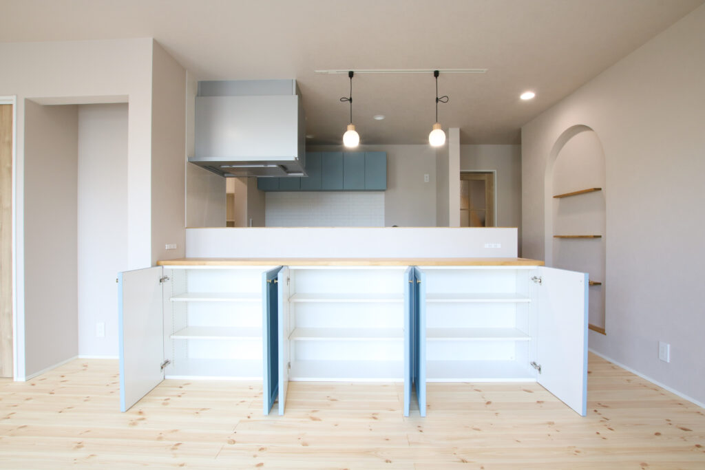 アクセントとしてブルーのキッチンを取り入れ、